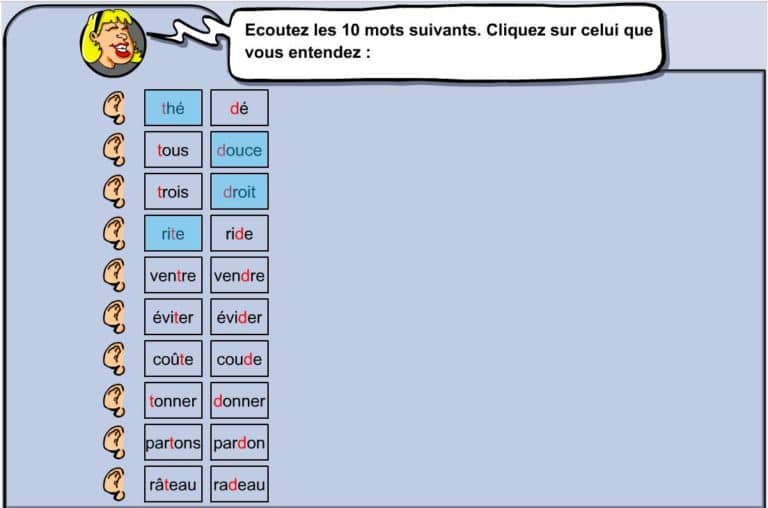 Reconnaitre le mot entendu parmi deux mots écrits très proches (confusions de sons ici t/d).